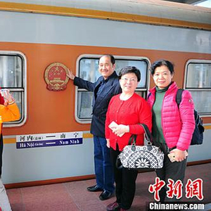图为中国出境游客在挂有中国国徽的车厢前合影留念。中新社记者 蒋雪林 摄