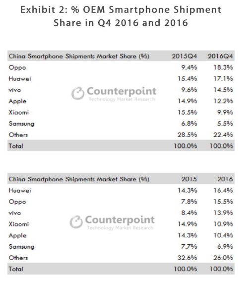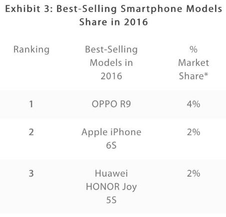 根据研究机构Counterpoint上周末发布的调研报告,在2016年最畅销机型排行榜中,苹果iPhone 6S所占市场份额仅2%,排名第一的是Oppo R9,市场占有率达4%。这也是自2012年以来,苹果iPhone首次跌出最畅销机型榜首。