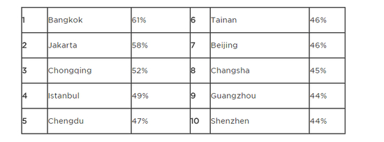 亚洲前十大堵城依次为:曼谷、雅加达、重庆、伊斯坦布尔、成都、台南、北京、长沙、广州、深圳,中国有七座城市上榜。