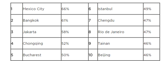 报告覆盖48个国家的390个大城市,依据车主因交通拥堵多花时间的百分比来获得各大城市的交通拥堵指数,然后做出排名。墨西哥城的拥堵指数高达66%,意味着在拥堵时间,车主平均要比正常行驶多花去66%的时间,在晚高峰时段要多花一倍的时间,平均每年堵车时间达227小时。