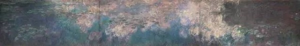 《睡莲》系列中,莫奈说,“在这无边无际的水面上,有着无穷尽的幻想”。吉维尼的花园,他的睡莲池和上方的天空,是画的主体,他表示从中可以看到边缘化的抽象感。在试图捕捉自然光线和色彩的不断变化的特性,空间与线条互相溶解,上面和下面,近与远,水和天空也融为一体。在他的大型油画氛围的笼罩下,莫奈试图创造“一个在开花的水中央,可以宁静地冥想的避难所。”