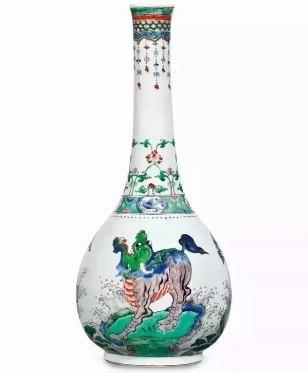 清康熙五彩海礁瑞兽纹大长颈瓶(摩根氏旧藏,后转洛克菲勒二世珍藏)。
