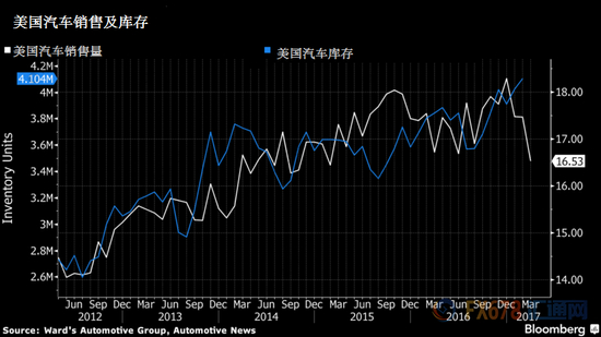 从下图中可以发现,从2016年底至2017年2月底,随着汽车销量不断下滑,美国汽车库存总体增加。