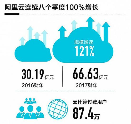 2017年5月18日晚间,在阿里巴巴公布的2017财年年报中,阿里云该财年的整体营收规模达到66.63亿元人民币,同比上年增长121%,连续两年实现三位数增长。
