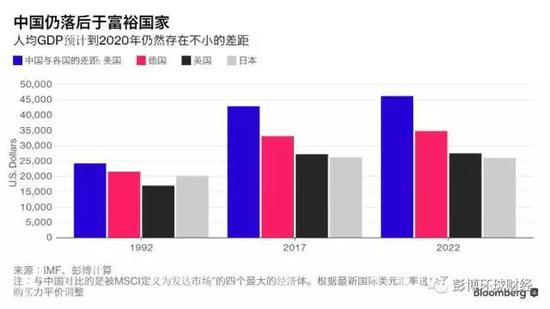 虽然取得了这么多进步,但在收入上和发达国家之间依然存在着差距:目前和日本存在2.6万美元的差距,和美国差距将近4.3万美元。即便是五年以后,这一差距也不会有多少改观。