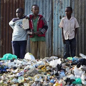 资料图:2010年4月7日,几名肯尼亚内罗毕当地男孩站在堆满垃圾塑料的“垃圾山”旁边。图片来源:东方IC