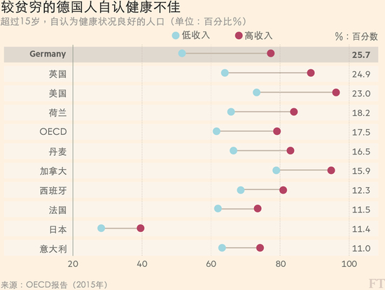 在健康方面,德国富人和穷人之间的差异似乎也超过欧盟平均水平。在自认为健康与否方面,德国的贫富差距仅小于4个经合组织成员国。