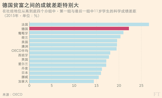 收入和资产的分配不均加剧了社会不平等。在由工业化国家组成的经合组织(OECD)举办的“国际学生评估项目”(PISA)中,德国学校领先于欧洲学校。但在缩小富有家庭和贫穷家庭的孩子之间的差距上,德国学校落后于欧洲其他国家。2015年,在德国,学生的家庭背景对其成绩差异的影响是16%,而经合组织的平均数字仅为13%;不过德国这方面的情况正在改善,2006年该影响还曾高达20%。