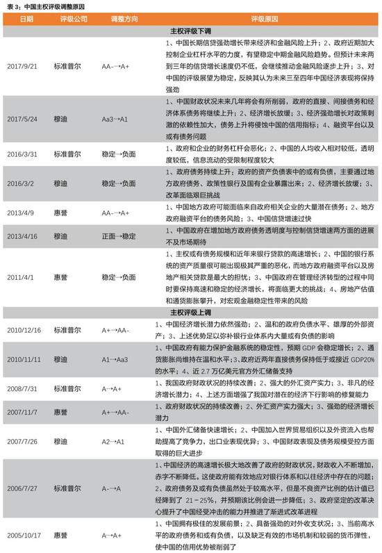 通过梳理三大评级机构调整中国主权评级具体的原因,我们发现,评级机构对一国主权评级的调整主要考察一国政府的负债水平和还钱的能力,具体就在政府债率、财政赤字、外汇储备等三大指标上体现。如果一国政府经济增速面临下滑风险,政府债务率和财政赤字较高,而外汇储备不够雄厚,流失也较快,则该国主权评级很可能面临下调风险,反之亦然。而具体对于中国的主权评级而言,三大评级机构对于我国融资平台和或有债务问题一直十分关注,也提出希望增加地方政府债务的透明度。在这个问题上的认识分歧也是导致三大评级机构对中国主权评级进行调整的一大原因。