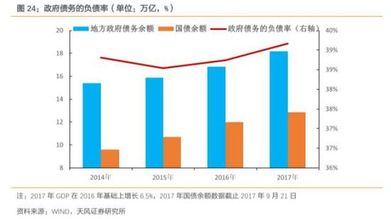 按照国家统计局公布的数据,2016年我国政府债务的负债率,即债务余额/GDP为36.7%,低于欧盟60%的警戒线,风险总体可控。按照我们的测算,2016年中央政府债务余额11.98万亿,地方政府债务16.84万亿,政府负债率38.74%,和国家统计局公布的出入不大,如果按照每年在38%-39%的负债率水平,按照目前国债余额和地方政府债务余额测算的2017年政府负债率为39.17%,略有超过该区间。