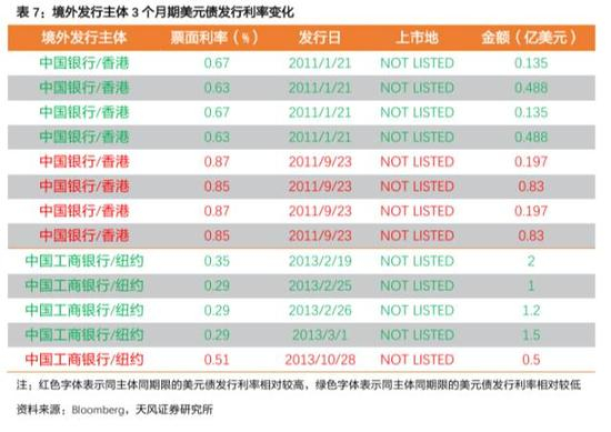 我们挑选相同发行主体在2011年4月1日和2013年4月9日评级调整前后发行同期限美元债的利率,可以发现中国银行香港分行和中国工商银行纽约分行在中国主权评级下调之后,在境外发债融资的成本都有所上升,分别上涨了约20-30个BP。而2011年相同期间美国国债3个月期收益率和2013年相同期间美国国债3年期收益率基本都是呈下行趋势。