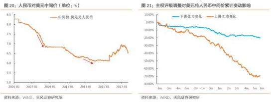 汇市方面:2013年4月9日当日人民币对美元中间价报6.2639,较上日中间价6.265升值11个基点,次日人民币对美元中间价报6.2548,较上日中间价升值91个基点,7个交易日内升值223个基点;2017年5月24日当日人民币对美元中间价报6.8758,较上日中间价6.8661贬值97个基点,次日人民币对美元中间价报6.8695,较上日中间价升值63个基点,7个交易日内升值824个基点。今天标普调整中国评级的消息发布后,人民币走势较平稳。评级上调对人民币汇率的正面影响比较大,而评级下调对其影响则比较有限。
