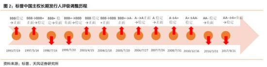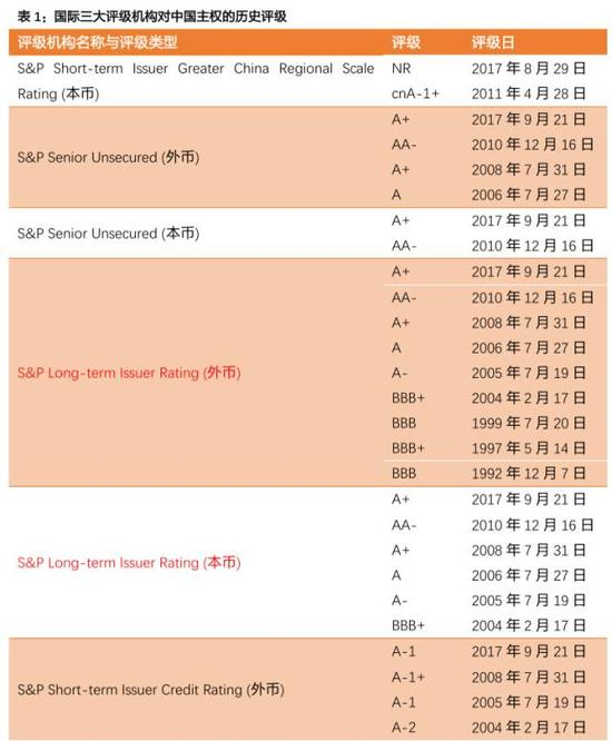 2017年9月21日,标普将中国长期主权信用评级由AA-调整为A+,短期债评级由A-1+调整为A-1,展望由负面调整为稳定。这是自1999年以来,标普首次下调中国主权评级。