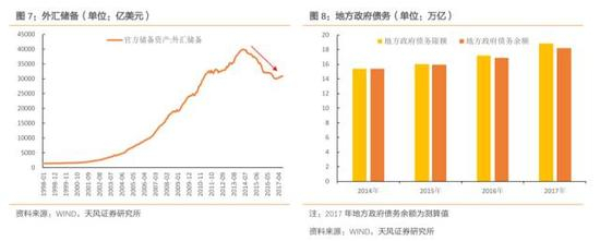 中国官方储备的外汇资产也由2014年中旬的4万亿美元不断流失,2017年4月仅为3.09万亿美元。而包含地方政府债券形式和非地方政府债券形式的地方政府债务余额最近几年也呈逐渐上升的趋势,但是增幅并不大,每年受财政部指导,地方政府也在置换存在的非地方政府债券形式的地方政府债务,地方政府债务总量更加明朗化。