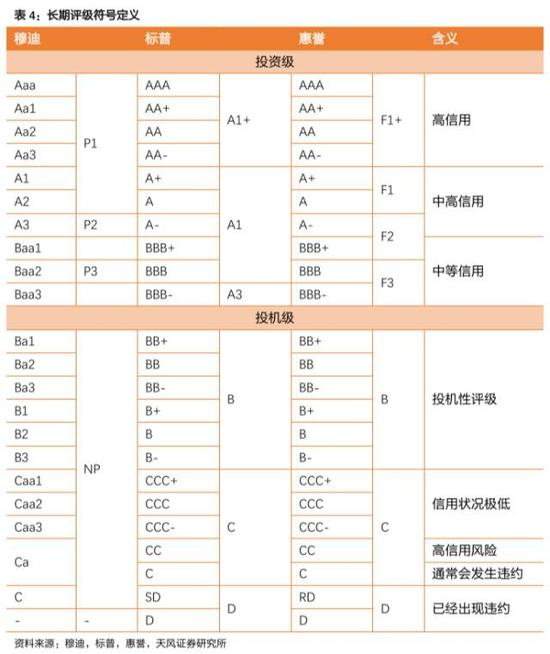 评级分为长期、短期、主体和债项评级。对于长期债项评级,穆迪采用三等分为21级,对于Aa至Caa级别,通过增加数字1、2、3来调整同类别中的相对排位,数字1表示级别在同类中最高,2次之,3则是最低,标普采用四等共有23级,对于AA至CCC级别,通过“+”和“-”来表示各类别中的相对强弱,惠誉与标普大致一样分为23级。穆迪评级分为Aaa,Aa1-3,A1-3,Baa1-3,Ba1-3,B1-3,Caa1-3,Ca和C,惠誉在此基础上还有D和RD评级,标普在此基础上还有D和SD评级。
