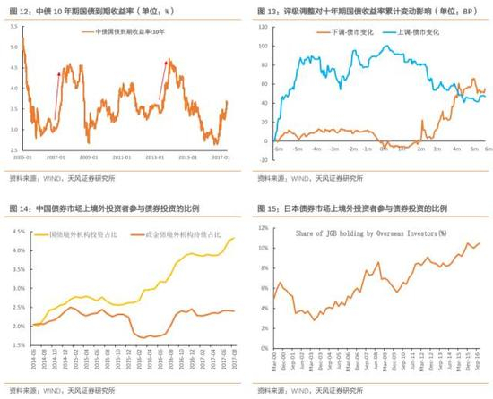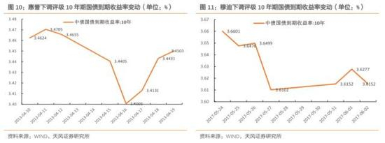 债市方面:2013年4月9日惠誉的下调行动之后,次日10年期国债收益率下行1BP,7个交易日内中国10年期国债收益率下行3BP,2017年5月24日,穆迪的下调行动之后,当日10年期国债收益率下行1BP,次日10年期国债收益率下行1BP,7个交易日内中国10年期国债收益率下行3BP,对国内债市的影响有限。