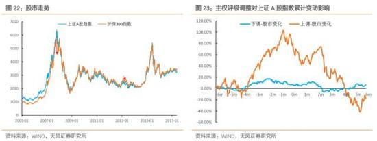 股市方面:2013年4月9日当日上证A股上涨0.64%,沪深300上涨了0.69%,次日上证A股上涨了0.02%,沪深300下跌了0.17%;2017年5月24日当日上证A股上涨0.07%,沪深300上涨了0.0008%,次日上证A股上涨了1.43%,沪深300上涨了1.80%。评级上调对国内股市有一定的正面影响,而评级下调对国内股市的影响则比较有限。