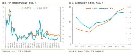 对于物价情况而言,在2007年中、2008年中和2011年中物价上涨之前,中国的通货膨胀率自1997年以来一直保持在5%以下,且波动幅度不大。但是政府的赤字率近几年不断攀升,2017年赤字率拟按3%安排,财政赤字2.38万亿元,比去年增加2000亿元。