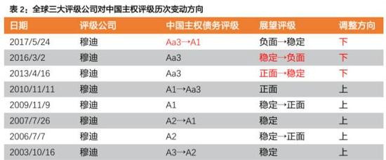 2017年5月24日,穆迪发布评级报告,将中国的评级从Aa3下调至A1。穆迪方面下调中国主权评级的原因主要在于认为中国的财政状况会有所恶化,整体债务规模将随着经济增长的放缓而继续上升。