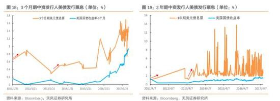 中资企业境外发行的美元债的期限集中在3个月、1年、3年和5年,我们观察3个月和3年期期限的美元债一级发行利率的变化情况,看国家主权评级下调对中资企业境外发债融资成本的影响。