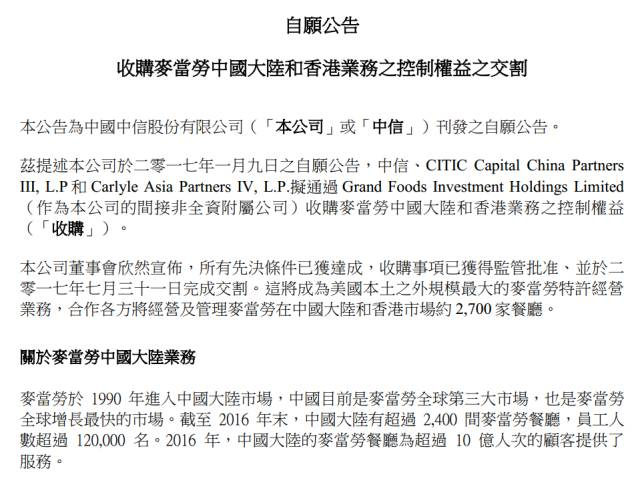 中信股份曾于今年1月9日公告,中信集团旗下的中信股份、中信资本控股、凯雷投资集团和麦当劳联合宣布达成战略合作并成立新公司,新公司将以最高20.8亿美元(约161.4亿港元)的总对价收购麦当劳在中国内地和香港的业务。