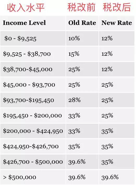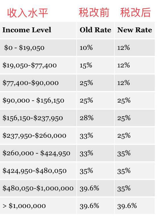 税改后:个人所得税也简化成3个等级:12%、25%、35%。富裕阶层的39.6%税率将保持不变。