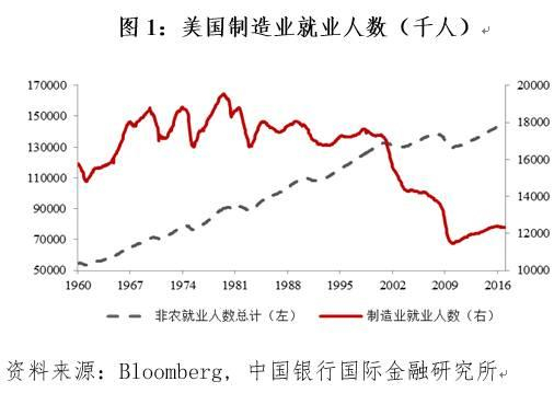 当前美国经济复苏基本稳固,失业率处于16年来最低水平,通胀指数逐渐朝2%目标迈进,美联储货币政策正常化进程逐渐加速,美元处于强势周期。然而,光鲜的经济指标难掩美国产业空心化危机。自20世纪80年代起,由于金融业高速发展和制造业外迁,美国制造业开始发生趋势性萎缩,制造业产值占GDP比重不断下滑,就业人口不断流失。产业空心化导致虚拟经济和实体经济发展逐渐失衡,社会结构走向两极化,贫富差距扩大,不利于美国教育投入和综合创新能力的提升,也不足以给经济增长带来持续而长久的支撑。