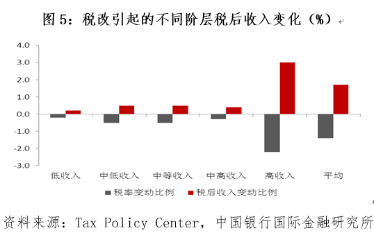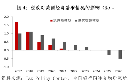 为了将减税对总产出的影响进一步量化,美国税收政策中心(Tax Policy Center)进行了相关预测(图4)。基于凯恩斯模型,减税会通过刺激总需求促进经济增长,第一年会拉动经济在原有基础上提高1.7%,第二年提高1.1%,正面效应将持续五年,但边际效应递减。基于世代交替模型,减税会通过影响家庭决策进而影响潜在产出的变化,据此估计减税会在前几年拉动经济增长,但自2024年开始会出现负向影响。原因可能在于总需求扩大会提升通胀水平,导致美联储继续提高利率,对私人部门投资产生挤出效应。因此,税改对产出的影响主要集中在短期,长期利好将逐渐消退,并有可能出现负面影响。