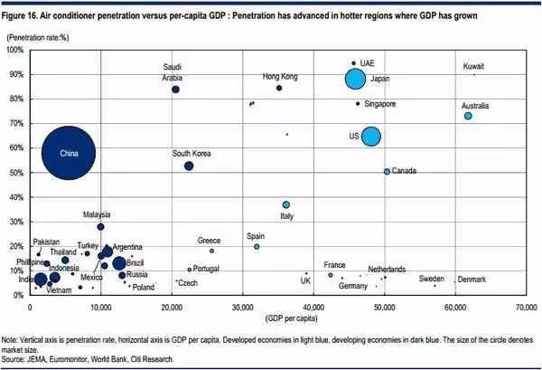 一般来讲,只有人均GDP达到2万美元以上的国家才用得起空调,中国显然是个例外。