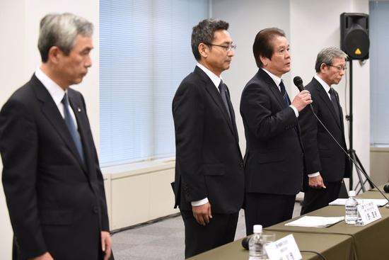 2017年11月24日,三菱承认产品数据存在作假后,三菱材料董事总经理竹内章(右二),三菱材料执行副总裁小野直树(左二),三菱电线工业总裁Hiroaki Murata(右一)和三菱伸铜总裁Kazumasa Hori(左一)在东京举办的发布会上公开道歉。11月24日,三菱材料承认产品数据造假后,股价下跌超过8%,三菱也是多家承认产品质量控制储存在问题的日本大公司之一。KAZUHIRO NOGI AFP/Getty Images