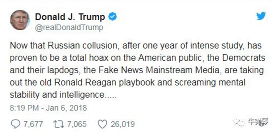 经过一年的集中调查,“通俄门”已经被证明是一场骗局,民主党和他们的走狗,假的主流新闻媒体,正在拿着旧的罗纳德·里根的剧本叫喊,说我的精神不稳定,并且说我的智力有问题……