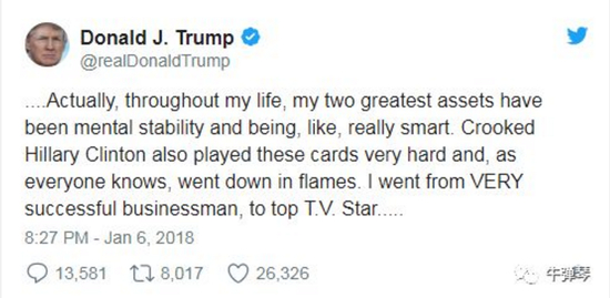 实际上,在我的一生中,我的两个最大的资产就是:精神稳定和非常聪明。骗子希拉里·克林顿也非常努力地打出了这些牌,大家都知道,她在烈火中倒下了。我从一个非常成功的商人,到一名顶级电视明星……