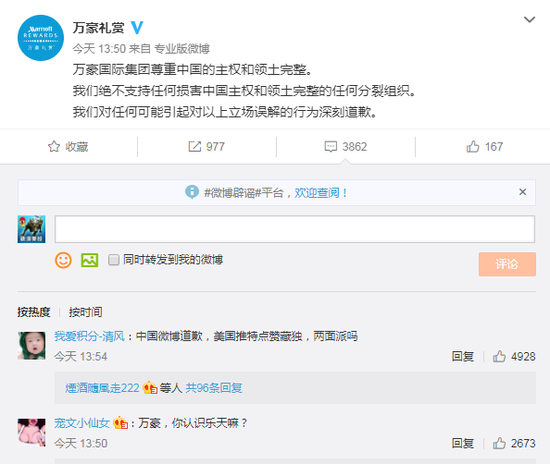 万豪礼赏11日下午再次发表声明称,“万豪国际集团尊重中国的主权和领土完整。我们绝不支持任何损害中国主权和领土完整的任何分裂组织。我们对任何可能引起对以上立场误解的行为深刻道歉。 ”