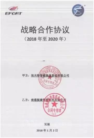 2018年1月2日, 埃夫特与南通振康正式签署第二个战略合作协议,埃夫特将在2018年至少采购3000台振康RV减速器,振康将保证产品优先供应和最短的供货周期。