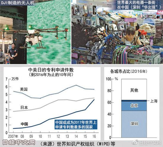 据世界知识产权组织(WIPO)统计,中国2017年在专利申请件数上有可能超过日美,跃居世界第一。实际上,其中的一半来自深圳。腾讯控股等超大型企业将总部设在深圳是因素之一。但是,从中国全境来到深圳、为迅速获取财富而创业的年轻人、以及被称为“海龟(海归)”的从美国回来的创业者在这里扎根,也被认为是推高申请数量的另一个原因所在。