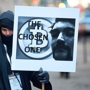 2015年,罗斯·乌布利希在纽约参加庭审时的一位抗议者(举着牌子)。法警局第一次拍卖的加密货币就是缉毒行动从罗斯·乌布利希身上缴获的比特币。Spencer Platt—Getty Images