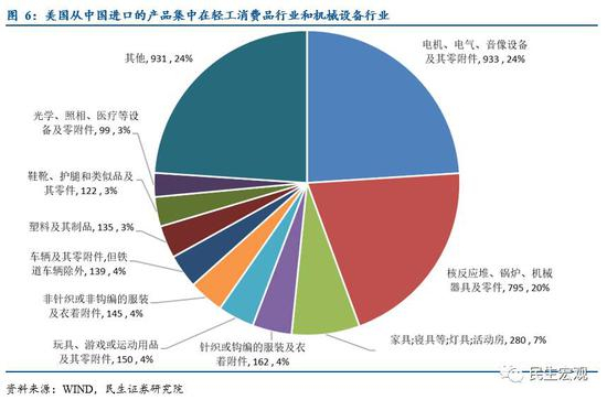 其他进口较多的商品集中在轻工消费品行业,包括家具(280亿美元,7.2%)、针织服装(162亿美元,4.2%)、玩具(150亿美元,3.9%)、非针织服装(145亿美元,3.7%)、汽车(140亿美元,3.6%)、塑料(135亿美元,3.5%)、鞋靴(122亿美元,3.1%)和光学设备(122亿美元,2.5%)。前10大行业合计占比76%。