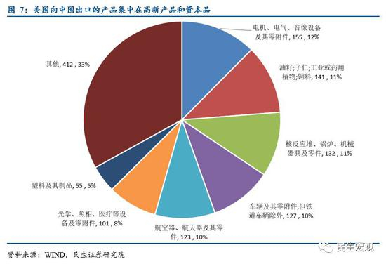 从出口看,美国向中国出口的商品以高附加值的技术密集型产品和资本密集型产品为主,集中于机械行业、汽车行业、航空行业和光学设备行业等。根据中国海关总署统计,16年美国向中出口商品1344亿美元。其中出口最多的商品是机电155亿美元(占比12.4%)、油籽141亿美元(占比11.3%)、机械132亿(占比10.6%)、汽车127亿美元(占比10.2%)、飞机123亿美元(占比9.8%)、光学设备101亿美元(占比8.1%)。商品分布较为均衡,都在10%左右,这六大行业合计占比63%。