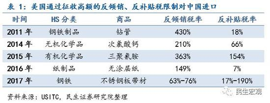 我们梳理了自2002年至今美国国际贸易委员会数据对中国发起的“双反”调查(反倾销、反补贴),合计246起,主要集中于钢铁行业(钢铁制品52起、钢铁19起,合计61起),化工行业(有机化学品29起、无机化学品23起、塑料9起,合计51起)和纸制品行业(14起)、贱金属行业和家具行业等。这些行业在过去属于贸易摩擦多发的行业,在未来一段时间内可能会持续。