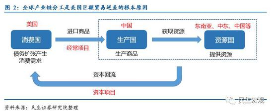 最后,生产国进行生产时从资源丰富的国家获取原材料,包括中东的石油、东南亚的橡胶、澳大利亚的铁矿石等。生产国和资源国通过合作提供产品的方式在经常项目赚取消费国的外汇,再通过资本项目回流到消费国,形成一条封闭的全球资金环。