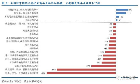 如果进一步看逆差商品的进出口对比,可以将其分为两类。一类是进口多,同时出口也多。以机电和机械为代表,两者在进出口方面都是排前二。贸易逆差主要来源于商品的技术含量差异,即美国向中国进口低端产品,出口中高端产品。低端产品的需求量更大,加上美国出于对核心技术的保护,在高端产品出口方面往往加以限制,从而导致巨额逆差。