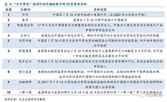 5月12日,“百日贸易”谈判计划取得一定的早期收获,中美双方工作团队在一个月以来进行了30轮磋商后,主要达成了10条重要共识,涉及农产品贸易、金融服务、投资、能源和一带一路等领域。商品贸易方面主要包括农产品贸易方面的相互开放,我国承诺在7月16日前解禁美国牛肉,这是我国自2003年因“疯牛病”禁止进口美国牛肉后,十四年以来首次开放,相对应地美国承诺放行中国禽肉。