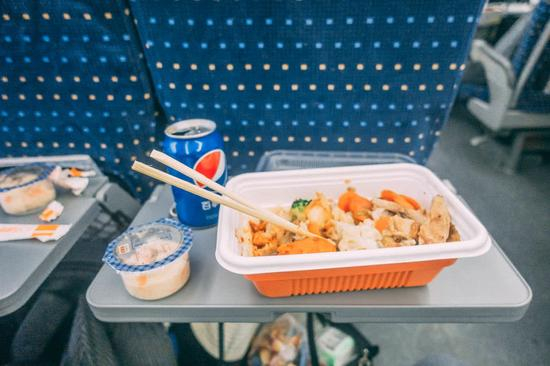 大多数高铁上有餐车,但它不像老式火车那样,不会开火做饭,而是提供预包装的微波食品。不过,我乘坐的这列高铁并没有餐车,只有列车员推着小车走过来,售卖饮料和方便面。
