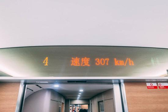 这是火车达到的最高速度:307公里/小时。