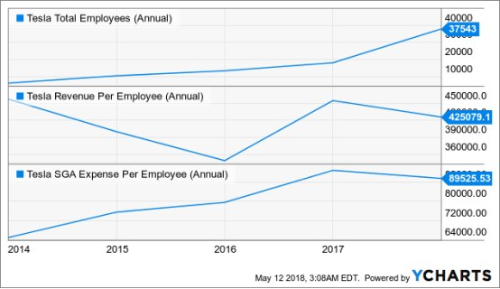 特斯拉高昂费用的一个关键问题是,它越来越依赖于用人力资源解决与工厂过度使用自动化有关的问题。今年4月,埃隆马斯克承认,自动化实际上减缓了Model 3的生产。在2017年,特斯拉的员工增加速度更快,虽然其增长速度仍落后于其收入增长。尽管分母持续增加,但每个员工的平均薪酬费用已经上升到将近9万美元。