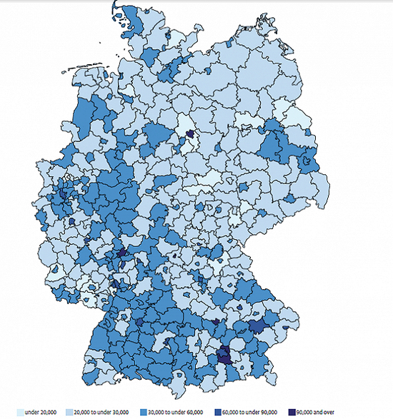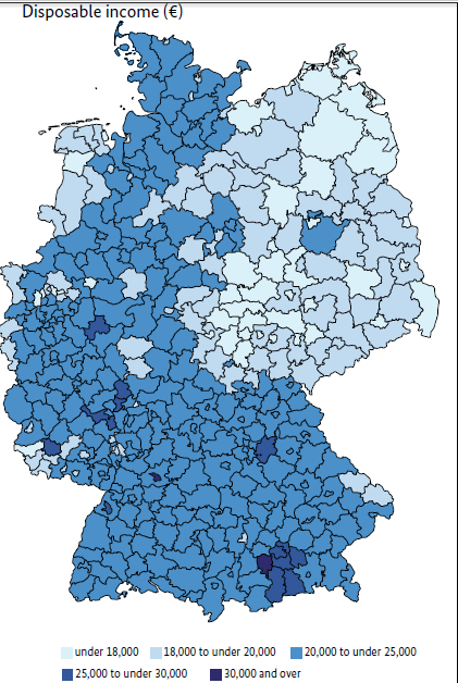 失业率较高地区通常来说可支配收入也较低。东部地区的家庭成员人均可支配收入大部分处于1.8万-2.5万欧元区间,西部地区的家庭成员人均可支配收入则大分部处于2.5万-3万欧元之间。