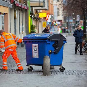 2018年1月5日,德国柏林,一名市政工人拉动一家快餐店门口的垃圾桶。图片来源:视觉中国