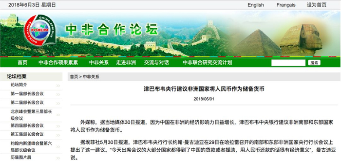 近日,中非合作论坛官网援引外媒消息称,因为中国在非洲的经济影响力日益增长,津巴布韦央行建议非洲南部和东部国家将人民币作为储备货币。