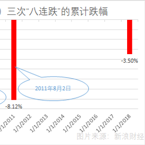 从道指ETF(DIA)1998年1月份成立开始,20年来,八个交易日是该基金时间最长的连续下跌纪录,共发生过三次,分别在2006年6月13日、2011年8月2日,以及昨日(21日)。在DIA可统计的5138个历史交易日中,“八连跌”发生的机会不足万分之六。