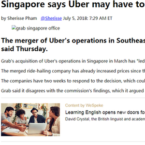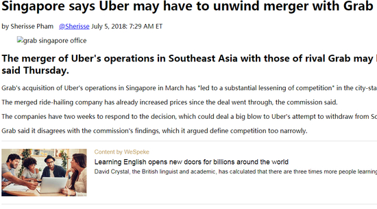 新加坡表示Uber可能不得不解除与Grab的合并